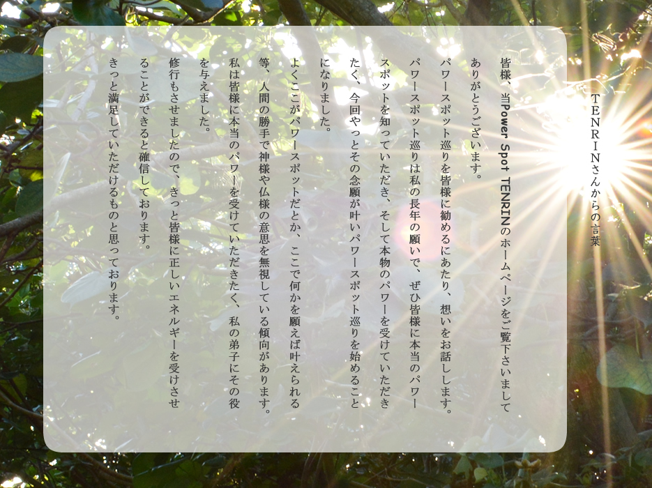 パワースポットテンリン 「本物のパワースポットとは...」「TENRINさんからの言葉」「パワースポット紹介」「案内人紹介」「写真集&参加者の様子&参加者の声」「料金」「商品紹介」「アクセス」「WEB予約」